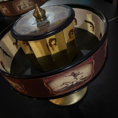 Découvrez le tambour magique, un dispositif utilisant l’effet stroboscopique et breveté en 1834. Faites tourner le cylindre et observez attentivement les images animées à travers les ouvertures.