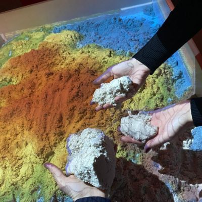 Jouez avec ce bac à sable interactif, représentant une carte topographique en trois dimensions et reproduisant le relief. Déplacez le sable à votre guise et créez votre propre carte.